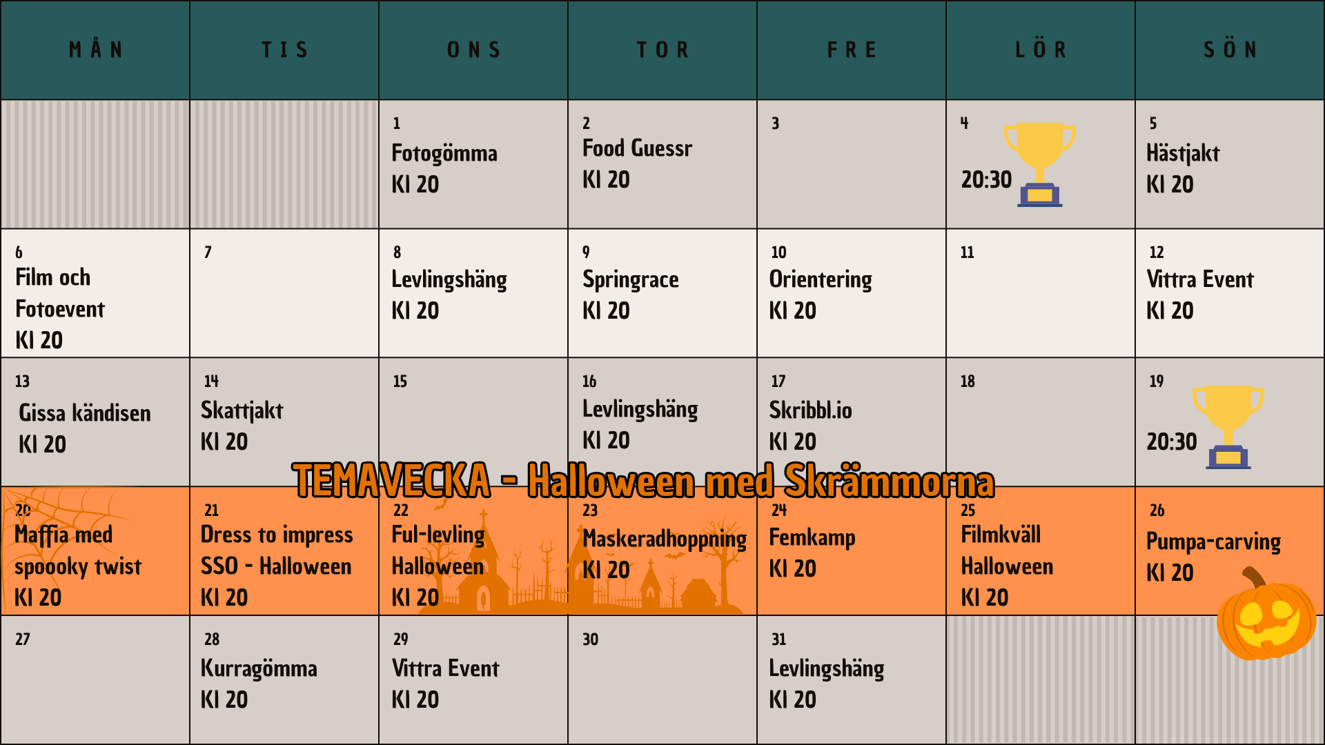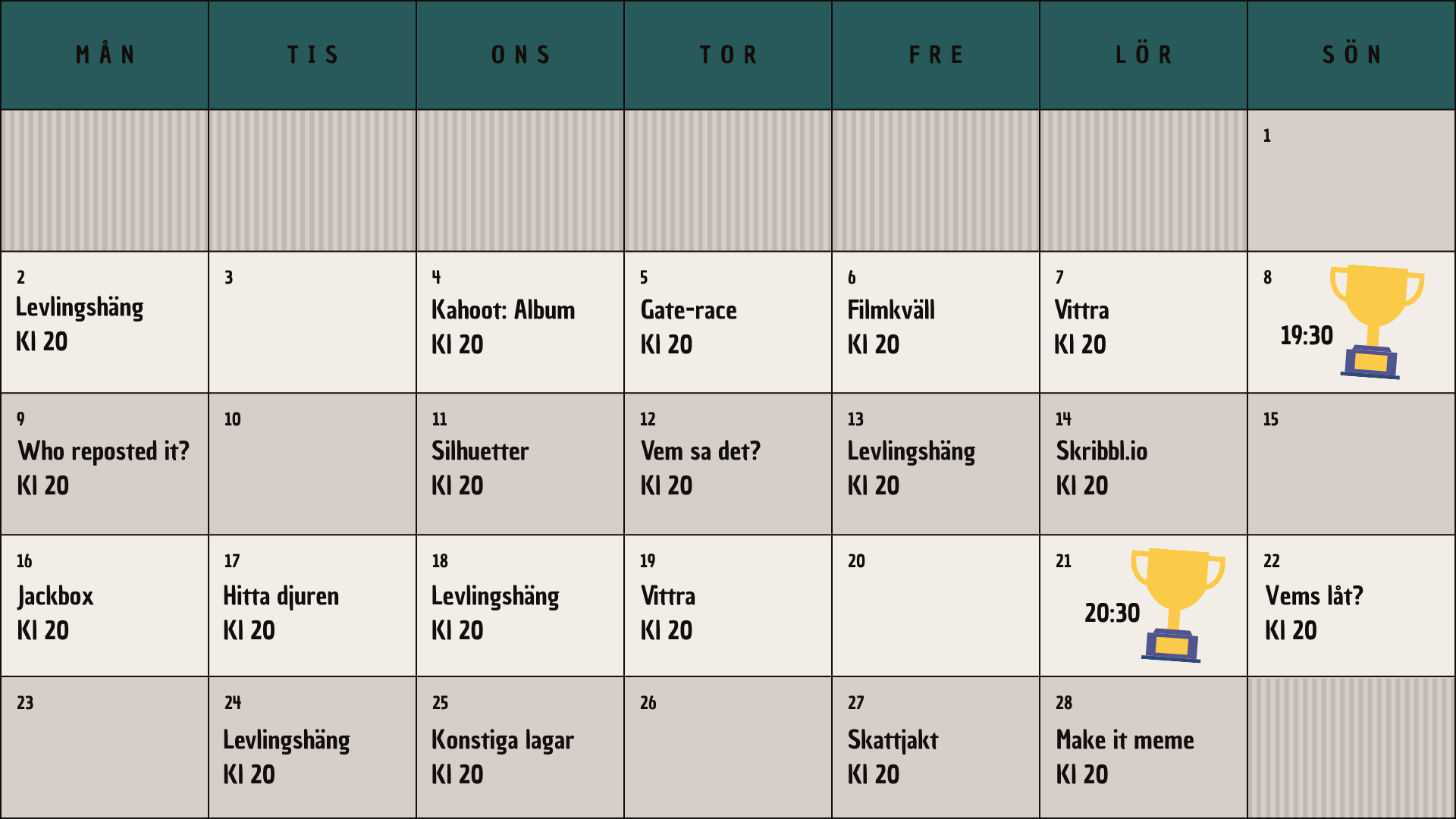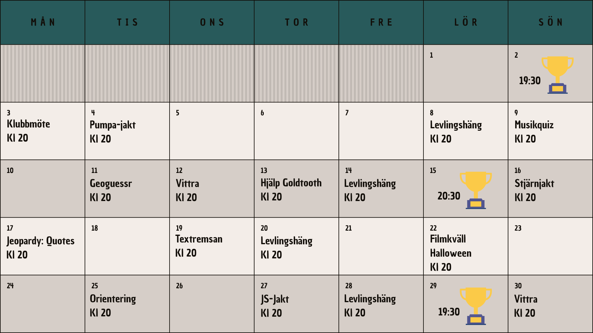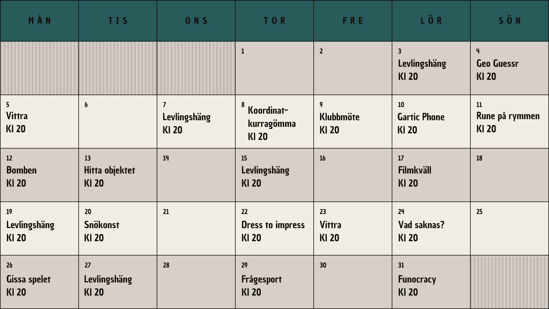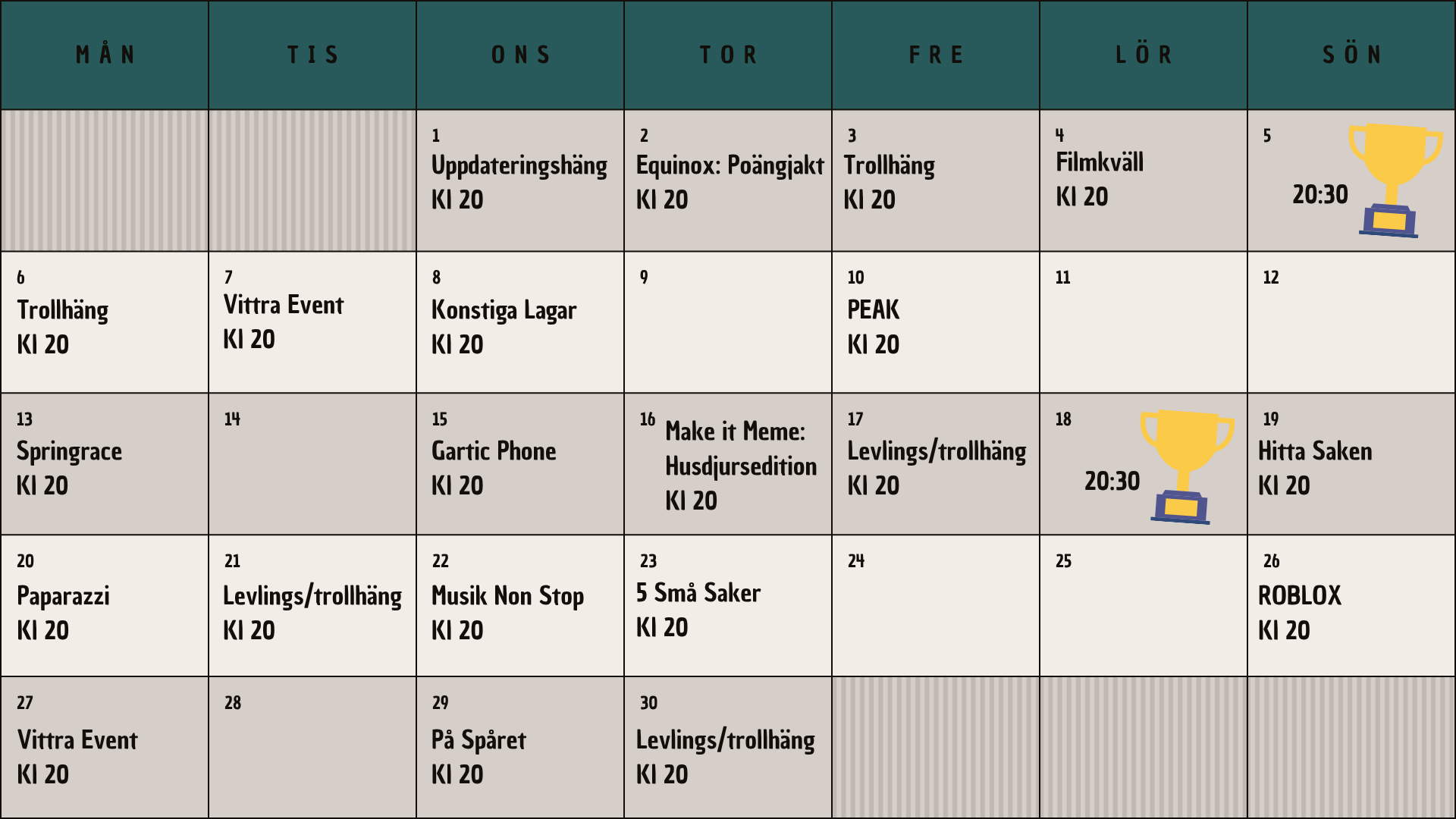 Här är vårat schema! Det uppdateras i början av månaden, men mer information och enklast för medlemmarna är att läsa i våran discord.